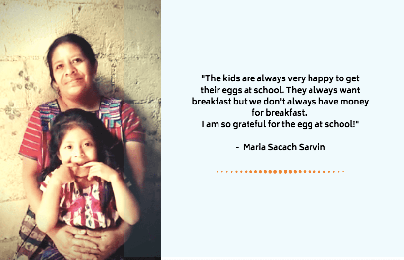 Since San Marcos Foundation began the nutrition program One Egg a Day/Un Huevo al Día at the primary school, Maria gained confidence that her family will consume more than the white bread and coffee she can provide them. Maria smiles as she tells us –